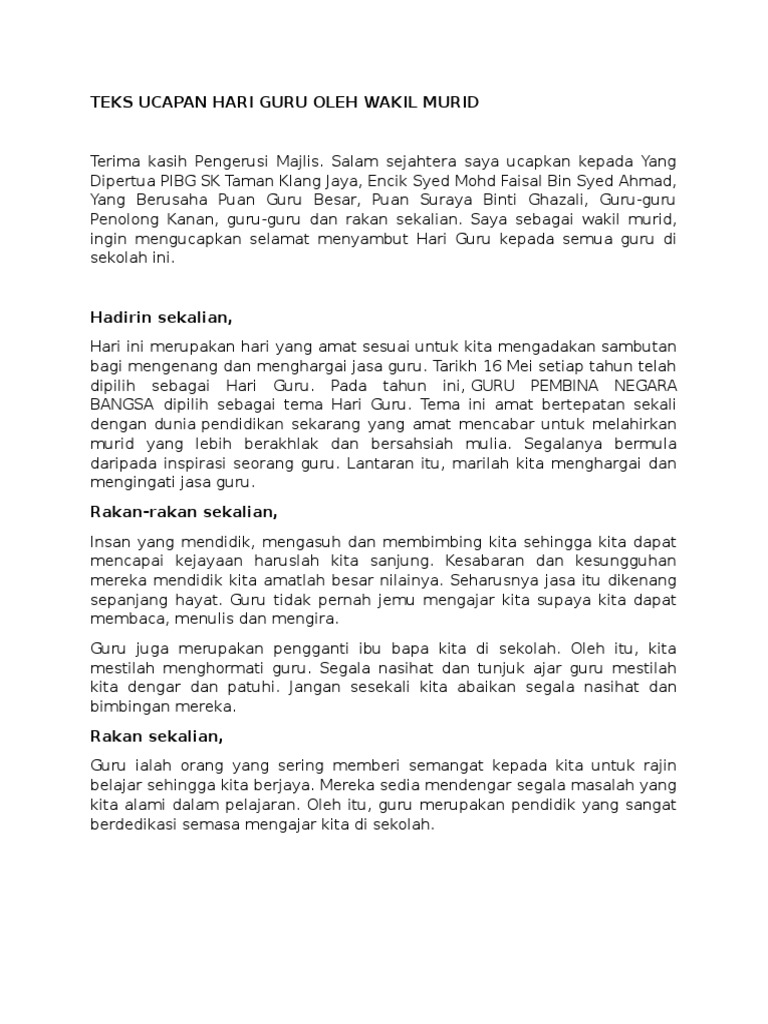 Hadirin sekalian tarikh 16 mei setiap t. Ucapan hari guru untuk bu guru engkau sudah berhasil menjadi sosok orang yang begitu berpengaruh di dalam hidupku. Bismillahir rahmanir rahim assalamualaikum warahmatullahi wabarakatuh salam 1malaysia dan salam perak aman jaya.