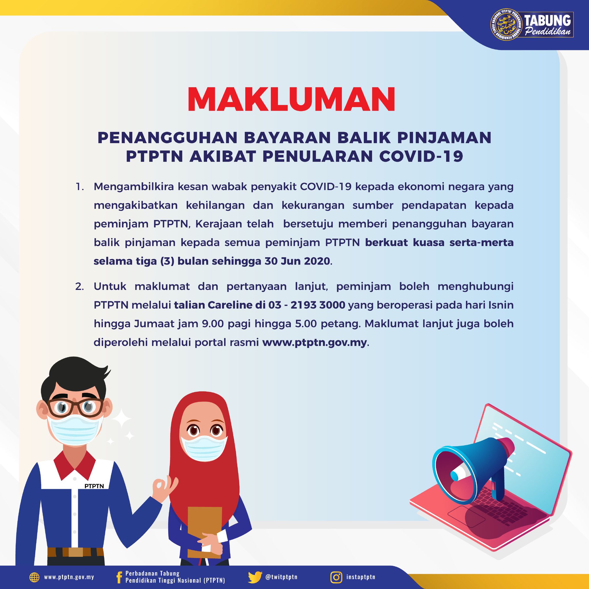 Ptptn On Twitter Penangguhan Bayaran Balik Pinjaman Ptptn Akibat Penularan Wabak Covid 19 Diharapkan Pengumuman Dari Kerajaan Ini Dapat Meringankan Sedikit Beban Para Peminjam Info Lanjut Boleh Layari Pautan Ini Https T Co Lcgmnh4qyo