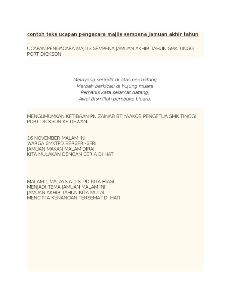 Jamuan akhir tahun 2010 1 assalamualaikum wbt dan salam sejahtera. Contoh teks pengacara majlis sambutan hari guru 2011. Akhir kata saya mengucapkan terima kasih kepada semua warga smk kampong jawa yang telah melaksanakan tugas dengan penuh dedikasi dan cemerlang sepanjang tahun 2014.