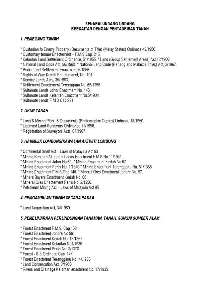 Senarai Undang Undang Berkaitan Pentadbiran Tanah Malaysia Government Information